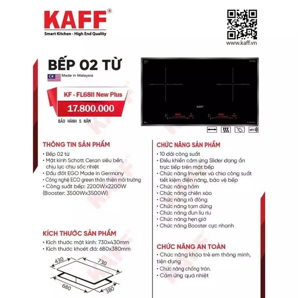 | Công suất mỗi bếp | 2200W – Booster 3500W |