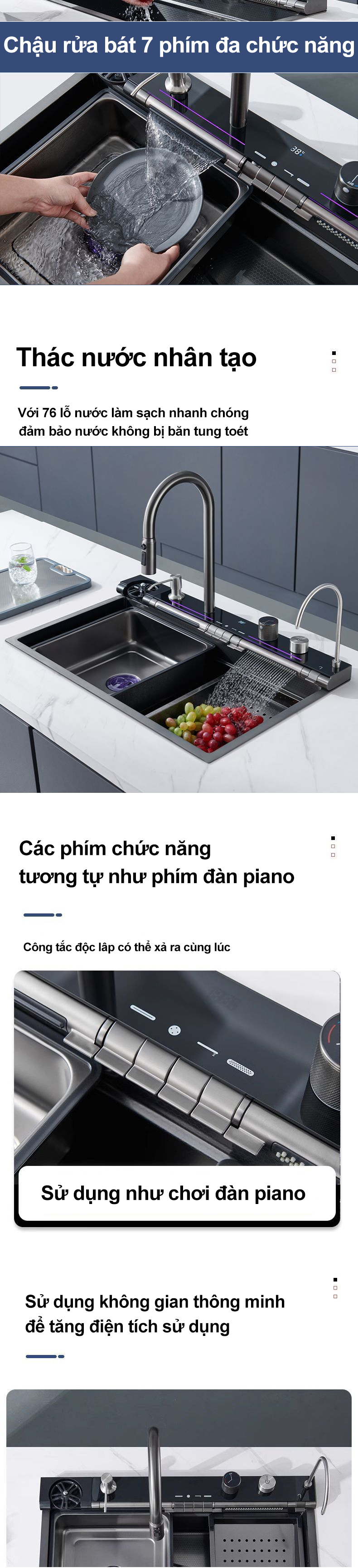 Chậu rửa bát 7 Phím được trang bị màn hình hiển thị nhiệt độ nước thông minh, giúp bạn tránh bỏng trong quá trình sử dụng. Ngoài ra, bảng vòi 7 phím bấm tiện lợi với các chế độ như rửa ly, rửa thác, vòi RO,... mang lại sự tiện lợi tối đa cho người sử dụng. Sơn chống thấm và chống ồn giúp bạn yên tĩnh trong quá trình sử dụng, tạo không gian bếp thư giãn và thoải mái.